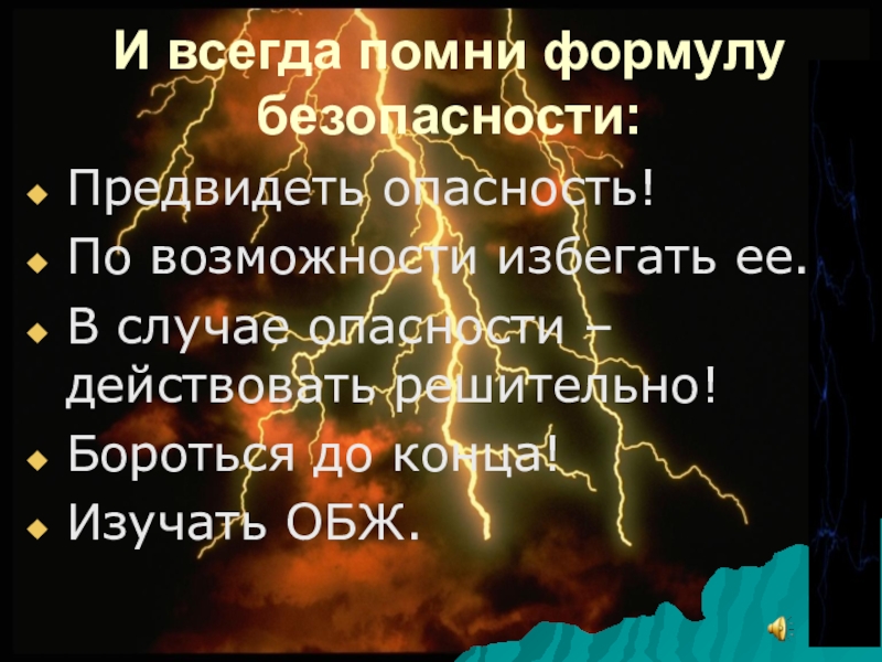 И всегда помни формулу безопасности:Предвидеть опасность!По возможности избегать ее.В случае опасности – действовать решительно!Бороться до конца!Изучать ОБЖ.