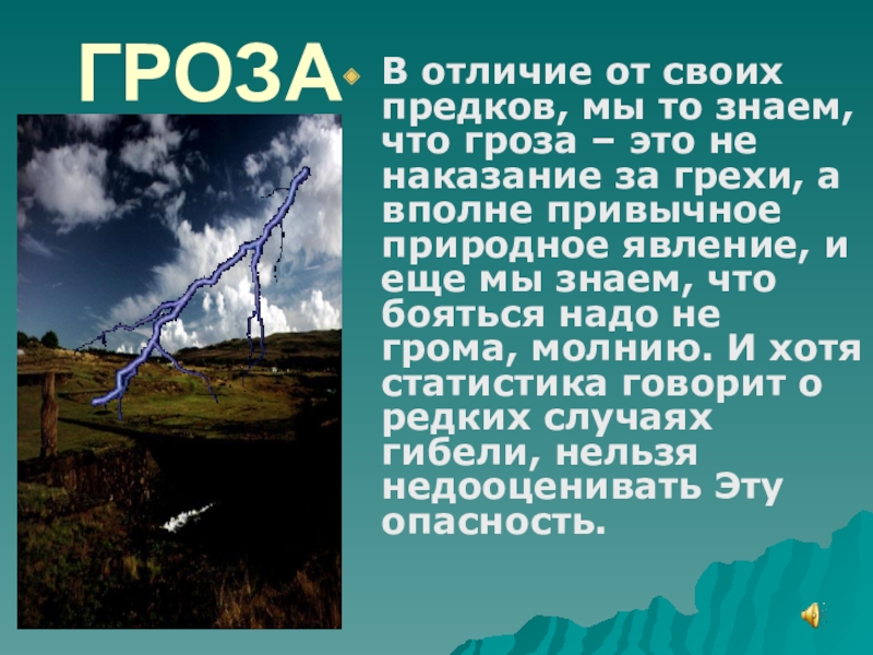 ГРОЗАВ отличие от своих предков, мы то знаем, что гроза – это не наказание за грехи, а вполне привычное природное явление, и еще мы знаем, что бояться надо не грома,