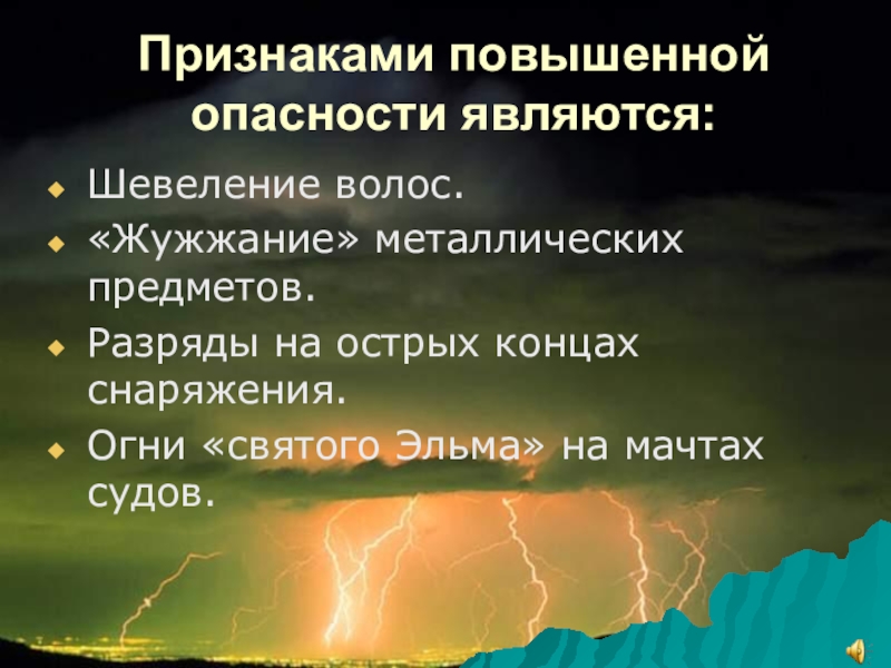 Признаками повышенной опасности являются:Шевеление волос.«Жужжание» металлических предметов.Разряды на острых концах снаряжения.Огни «святого Эльма» на мачтах судов.