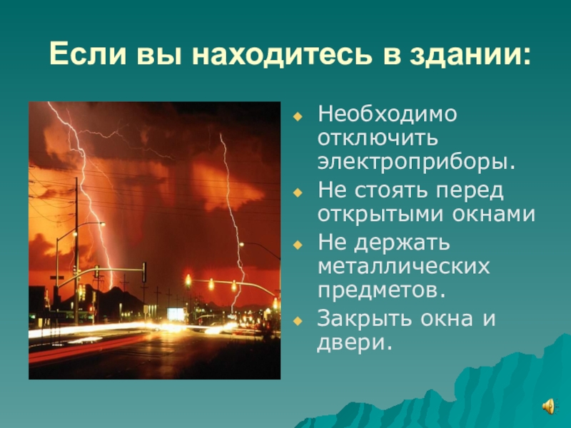 Если вы находитесь в здании:Необходимо отключить электроприборы.Не стоять перед открытыми окнамиНе держать металлических предметов.Закрыть окна и двери.