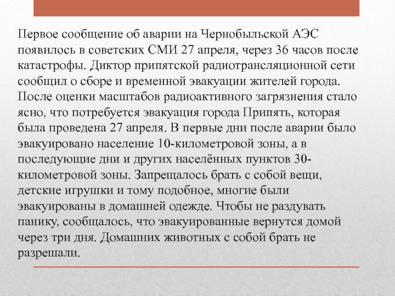 После оценки масштабов радиоактивного загрязнения стало ясно, что потребуется эвакуация города Припять, которая была проведена 27 апреля. В первые дни после аварии было эвакуировано население 10-километровой зоны, а в последующие дни и других населённых пунктов 30-километровой зоны. Запрещалось брать с собой вещи, детские игрушки и тому подобное, многие были эвакуированы в домашней одежде. Чтобы не раздувать панику, сообщалось, что эвакуированные вернутся домой через три дня. Домашних животных с собой брать не разрешали.