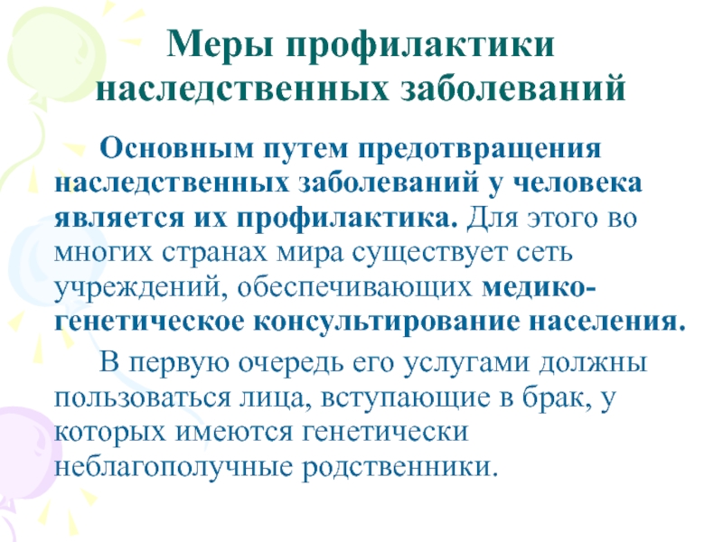 этого во многих странах мира существует сеть учреждений, обеспечивающих медико-генетическое консультирование населения.В первую очередь его услугами должны пользоваться лица, вступающие в брак, у которых имеются генетически неблагополучные родственники.
