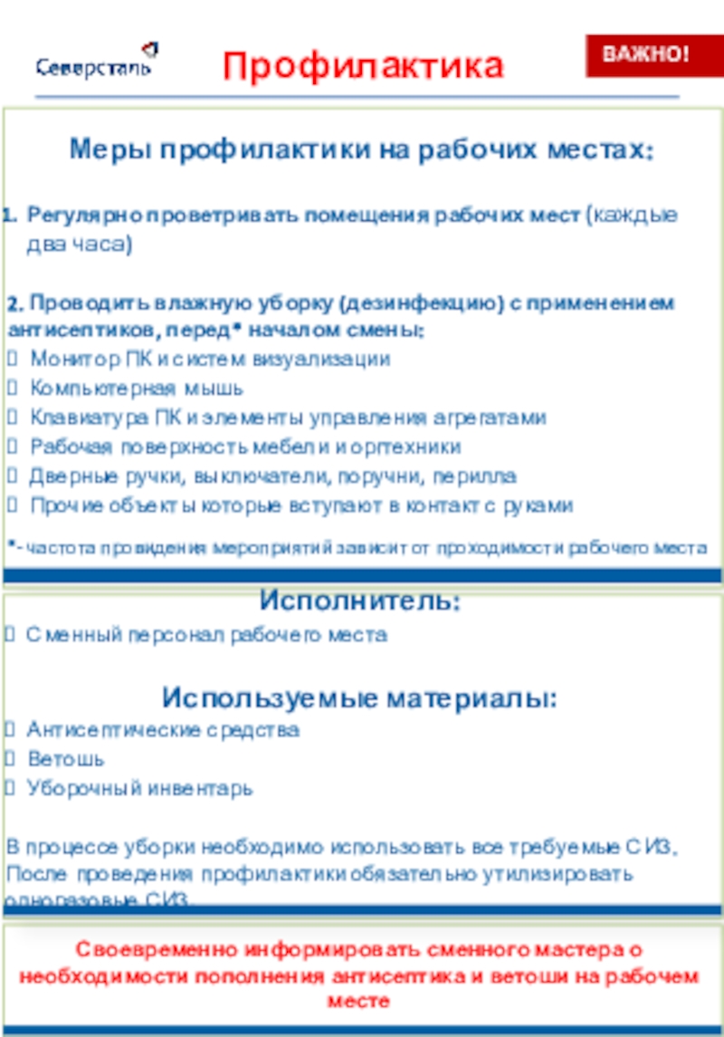 В процессе уборки необходимо использовать все требуемые СИЗ. После проведения профилактики обязательно утилизировать одноразовые СИЗ.