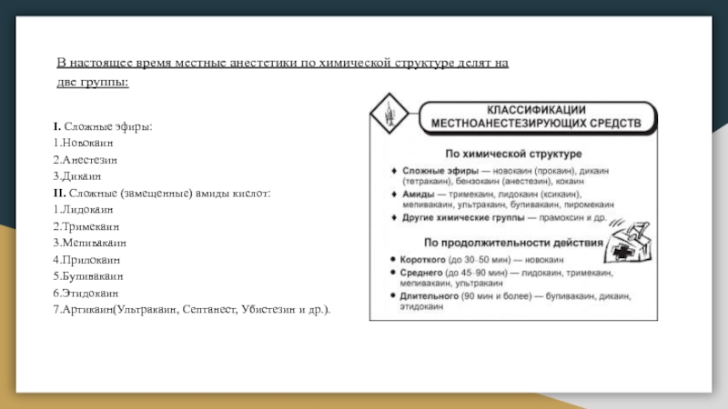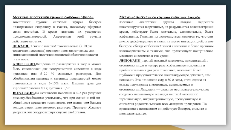 Местные анестетики группы амидов медленнее инактивируются в организме, не разрушаются холинестеразой крови, действуют более длительно, следовательно, более эффективны. Главным их достоинством является то, что они лучше диффундируют в ткани на месте инъекции, действуют быстрее, обладают большей зоной анестезии и более прочным взаимодействием с тканями, что препятствует поступлению местного анестетика в ток крови.