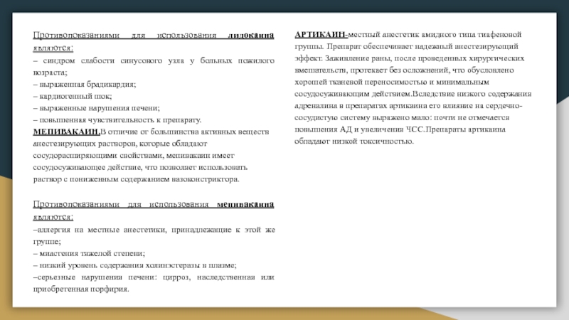 ЛИДОКАИН-первый амидный анестетик, применяемый в стоматологии,он в четыре раза эффективнее новокаина и приблизительно в два раза токсичнее, оказывает более глубокое и продолжительное анестезирующее действие, чем новокаин. Это позволило ему, в 50-е годы, стать одним из самых популярных анестетиков, используемых в стоматологии.Лидокаин — сильное местноанестезирующее средство, вызывающее все виды местной анестезии: терминальную, инфильтрационную, проводниковую и считается родоначальником всех амидных препаратов. По сравнению с новокаином он действует быстрее, сильнее и продолжительнее.