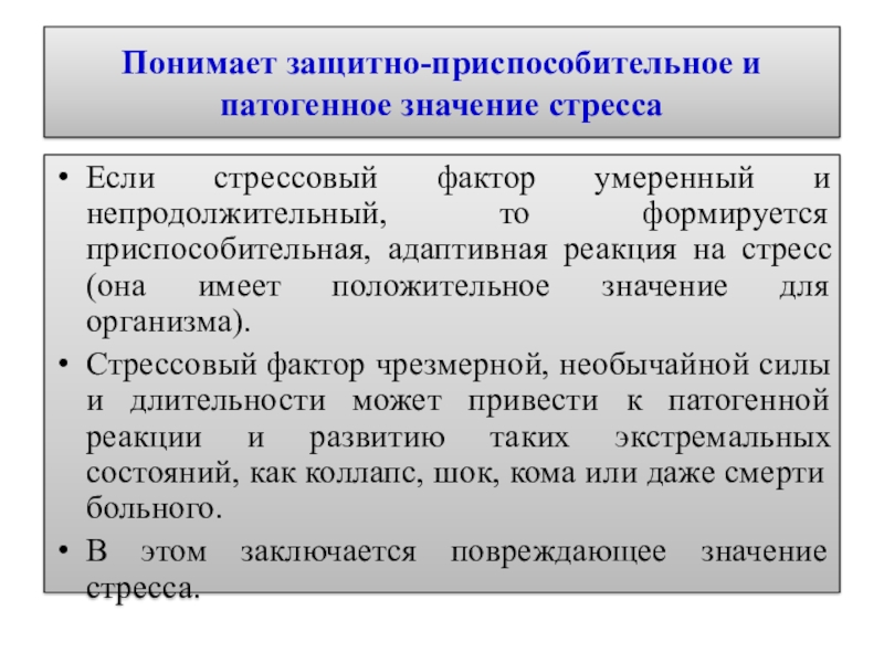 Слайд 13Понимает защитно-приспособительное и патогенное значение стресса