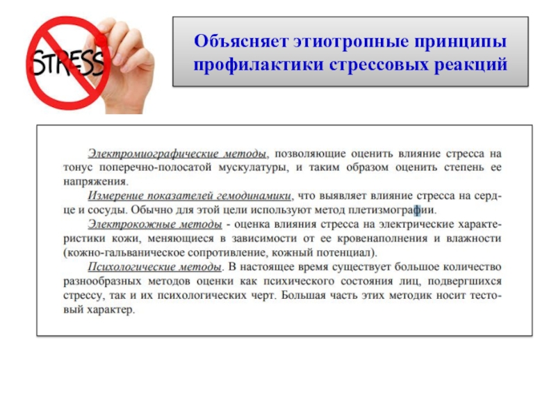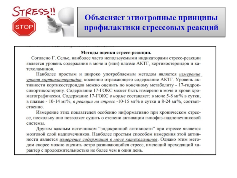 Слайд 14Объясняет этиотропные принципы профилактики стрессовых реакций