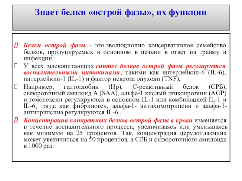 Например, гаптоглобин (Hp), С-реактивный белок (СРБ), сывороточный амилоид А (SAA), альфа-1 кислый гликопротеин (AGP) и гемопексин регулируются в основном IL-1 или комбинацией IL-1 и IL-6, тогда как фибриноген, альфа-1- антихимотрипсин и альфа-1-антитрипсина регулируются IL-6 .