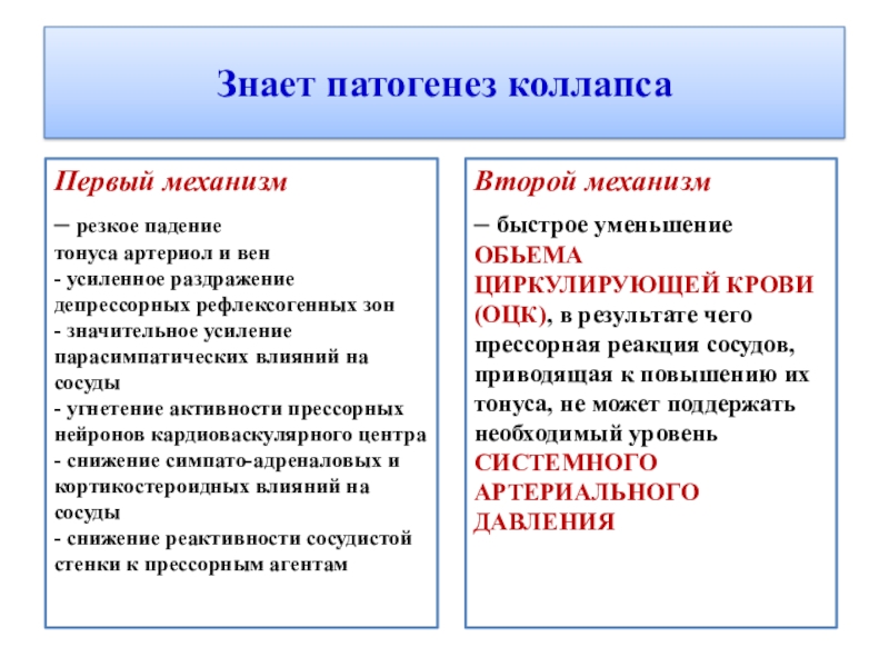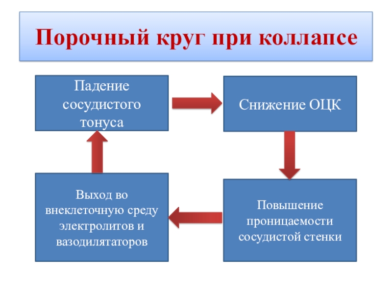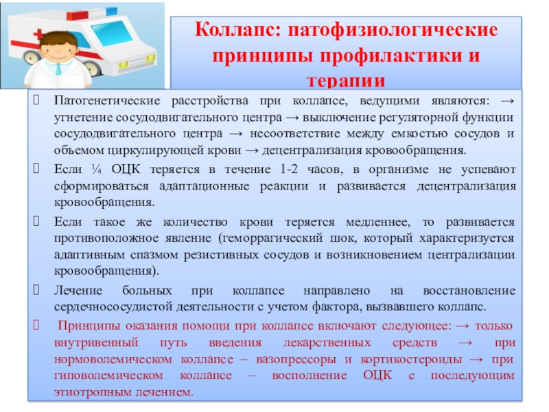 Принципы оказания помощи при коллапсе включают следующее: → только внутривенный путь введения лекарственных средств → при нормоволемическом коллапсе – вазопрессоры и кортикостероиды → при гиповолемическом коллапсе – восполнение ОЦК с последующим этиотропным лечением.