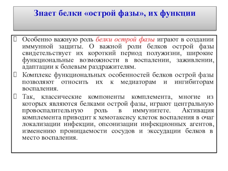 Так, классические компоненты комплемента, многие из которых являются белками острой фазы, играют центральную провоспалительную роль в иммунитете. Активация комплемента приводит к хемотаксису клеток воспаления в очаг локализации инфекции, опсонизации инфекционных агентов, изменению проницаемости сосудов и экссудации белков в место воспаления.