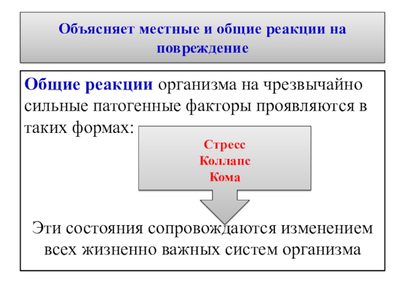 Слайд 4Объясняет местные и общие реакции на повреждение