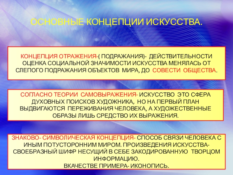 ЗНАКОВО- СИМВОЛИЧЕСКАЯ КОНЦЕПЦИЯ- СПОСОБ СВЯЗИ ЧЕЛОВЕКА С ИНЫМ ПОТУСТОРОННИМ МИРОМ. ПРОИЗВЕДЕНИЯ ИСКУССТВА- СВОЕБРАЗНЫЙ ШИФР НЕСУЩИЙ В СЕБЕ ЗАКОДИРОВАННУЮ ТВОРЦОМ ИНФОРМАЦИЮ.
