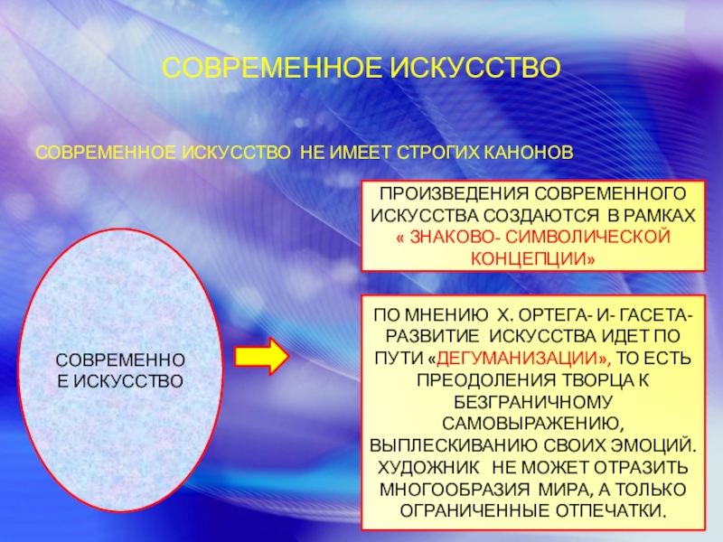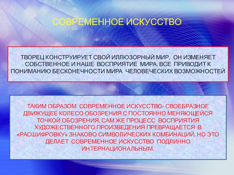 ТАКИМ ОБРАЗОМ СОВРЕМЕННОЕ ИСКУССТВО- СВОЕБРАЗНОЕ ДВИЖУЩЕЕ КОЛЕСО ОБОЗРЕНИЯ С ПОСТОЯННО МЕНЯЮЩЕЙСЯ ТОЧКОЙ ОБОЗРЕНИЯ. САМ ЖЕ ПРОЦЕСС ВОСПРИЯТИЯ ХУДОЖЕСТВЕННОГО ПРОИЗВЕДЕНИЯ ПРЕВРАЩАЕТСЯ В «РАСШИФРОВКУ» ЗНАКОВО СИМВОЛИЧЕСКИХ КОМБИНАЦИЙ. НО ЭТО ДЕЛАЕТ СОВРЕМЕННОЕ ИСКУССТВО ПОДЛИННО ИНТЕРНАЦИОНАЛЬНЫМ.