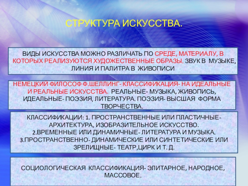 НЕМЕЦКИЙ ФИЛОСОФ Ф.ШЕЛЛИНГ- КЛАССИФИКАЦИЯ- НА ИДЕАЛЬНЫЕ И РЕАЛЬНЫЕ ИСКУССТВА. РЕАЛЬНЫЕ- МУЗЫКА, ЖИВОПИСЬ, ИДЕАЛЬНЫЕ- ПОЭЗИЯ, ЛИТЕРАТУРА. ПОЭЗИЯ- ВЫСШАЯ ФОРМА ТВОРЧЕСТВА.
