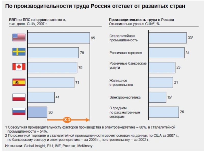 ВВП России - приблизительно одна седьмая ВВП США, а доход на душу населения (в терминах ППС) составляет $24000, ВВП США $ 53 000, что составляет - 45% от США.