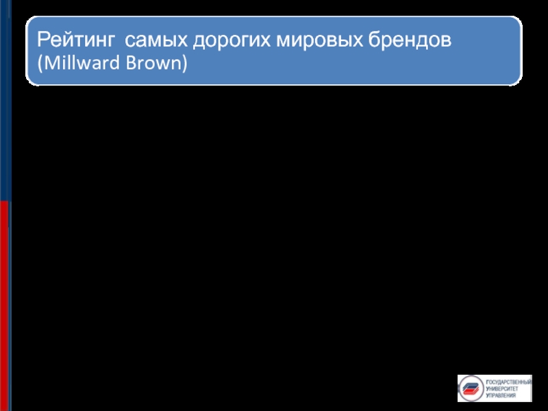 Первая десятка рейтинга 100 самых дорогих мировых брендов 2011 года выглядит следующим образом:
