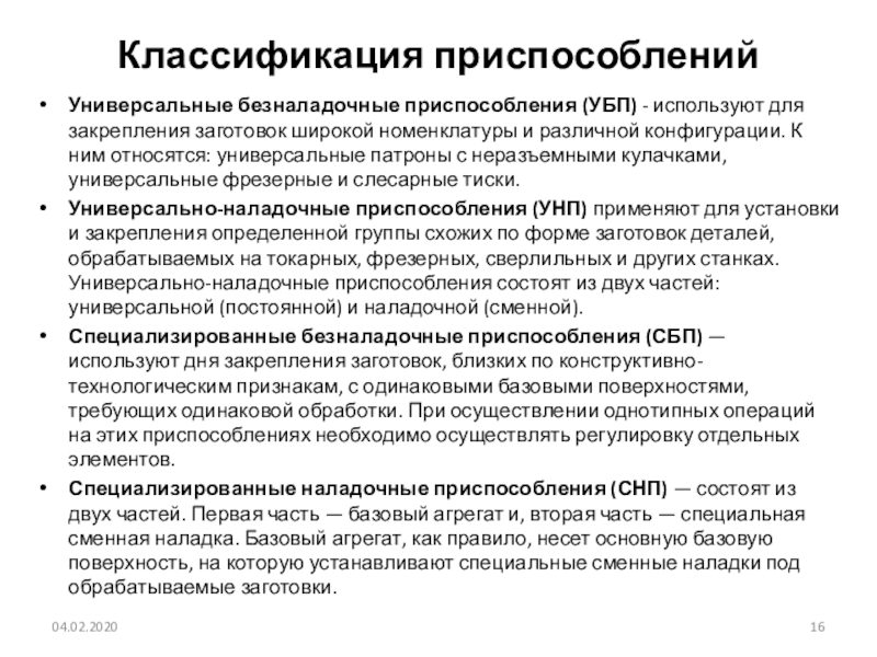 Специализированные безналадочные приспособления (СБП) — используют дня закрепления заготовок, близких по конструктивно-технологическим признакам, с одинаковыми базовыми поверхностями, требующих одинаковой обработки. При осуществлении однотипных операций на этих приспособлениях необходимо осуществлять регулировку отдельных элементов.