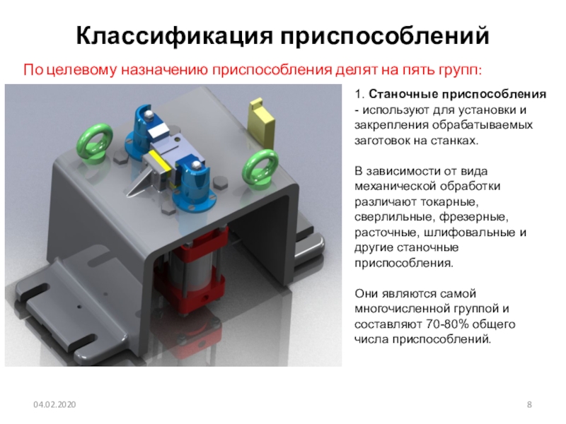 различают токарные, сверлильные, фрезерные, расточные, шлифовальные и другие станочные приспособления.
