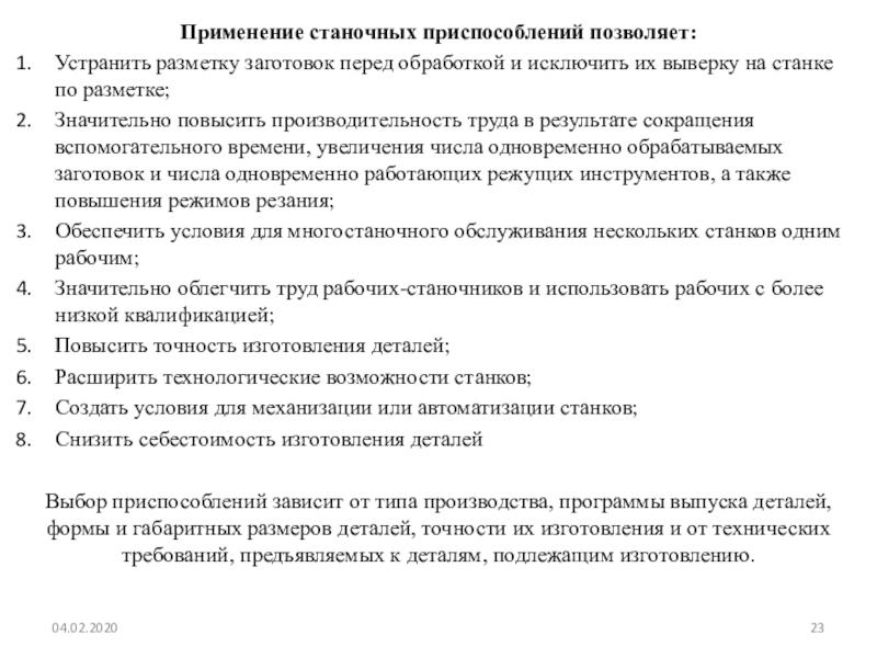 Выбор приспособлений зависит от типа производства, программы выпуска деталей, формы и габаритных размеров деталей, точности их изготовления и от технических требований, предъявляемых к деталям, подлежащим изготовлению.