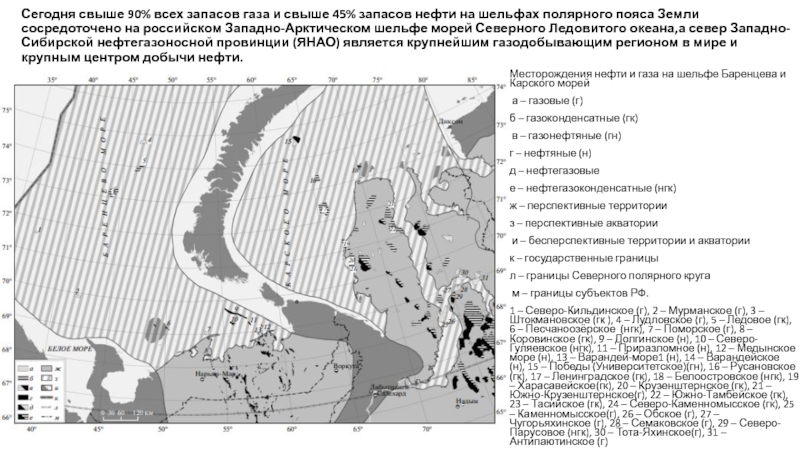 1 – Северо-Кильдинское (г), 2 – Мурманское (г), 3 – Штокмановское (гк ), 4 – Лудловское (г), 5 – Ледовое (гк), 6 – Песчаноозёрское (нгк), 7 – Поморское (г), 8 – Коровинское (гк), 9 – Долгинское (н), 10 – Северо-Гуляевское (нгк), 11 – Приразломное (н), 12 – Медынское море (н), 13 – Варандей-море1 (н), 14 – Варандейское (н), 15 – Победы (Университетское)(гн), 16 – Русановское (гк), 17 – Ленинградское (гк), 18 – Белоостровское (нгк), 19 – Харасавейское(гк), 20 – Крузенштернское (гк), 21 – Южно-Крузенштернское(г), 22 – Южно-Тамбейское (гк), 23 – Тасийское (гк), 24 – Северо-Каменномысское (гк), 25 – Каменномысское(г), 26 – Обское (г), 27 – Чугорьяхинское (г), 28 – Семаковское (г), 29 – Северо-Парусовое (нгк), 30 – Тота-Яхинское(г), 31 – Антипаютинское (г)