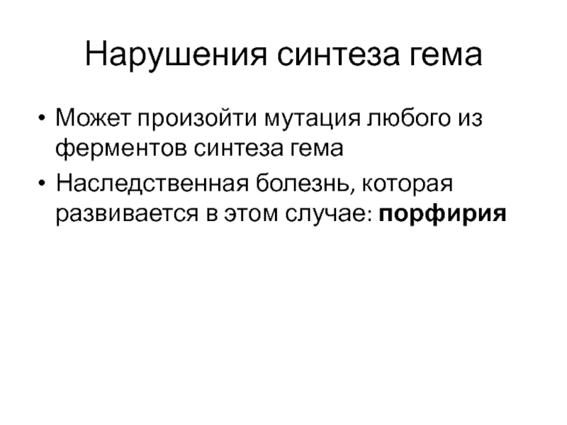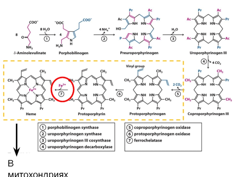 Последняя реакция: в протопорфирин включается Fe2+ (фермент феррохелатаза), в результате образуется гем