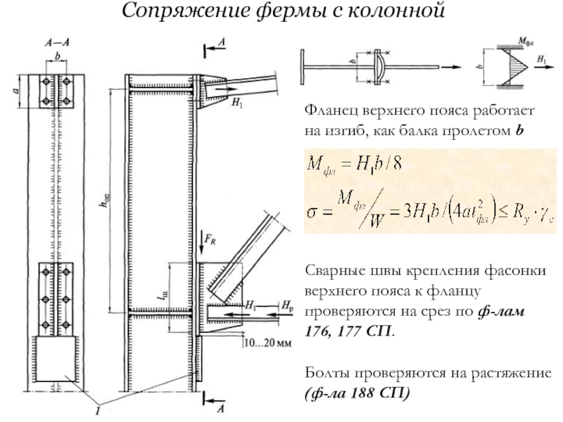 Сопряжение фермы с колоннойФланец верхнего пояса работает на изгиб, как балка пролетом bСварные швы крепления фасонки верхнего