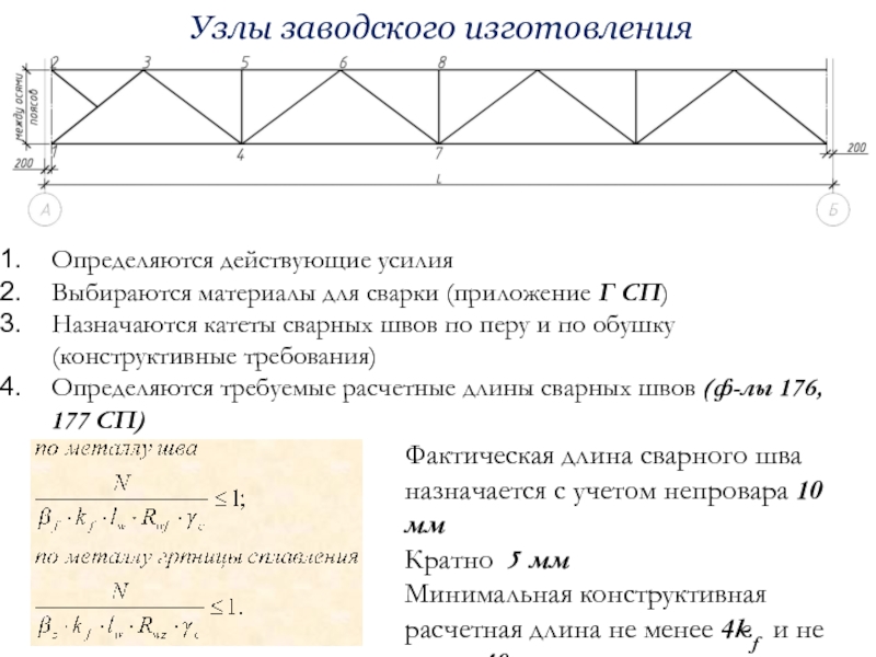 Узлы заводского изготовленияОпределяются действующие усилияВыбираются материалы для сварки (приложение Г СП)Назначаются катеты сварных швов по перу и