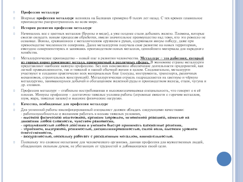 Металлургическое производство – новый шаг в развитии человечества. Металлург – это работник, который из горных пород производит металл, применяемый в различных сферах. В экономике страны металлурги представляют наиболее важную профессию. Без них невозможно обеспечение деятельности предприятий, как легкой промышленности, так и тяжелой и нашей обычной жизни в целом. Следовательно, металлурги участвуют в создании практически всех материальных благ (посуды, инструмента, транспорта, различных механизмов, строительных конструкций). Металлургическая отрасль подразделяется на цветную и чёрную металлургию, занимающуюся добычей и обогащением железной руды и производством железа, стали, чугуна и др. сплавов.