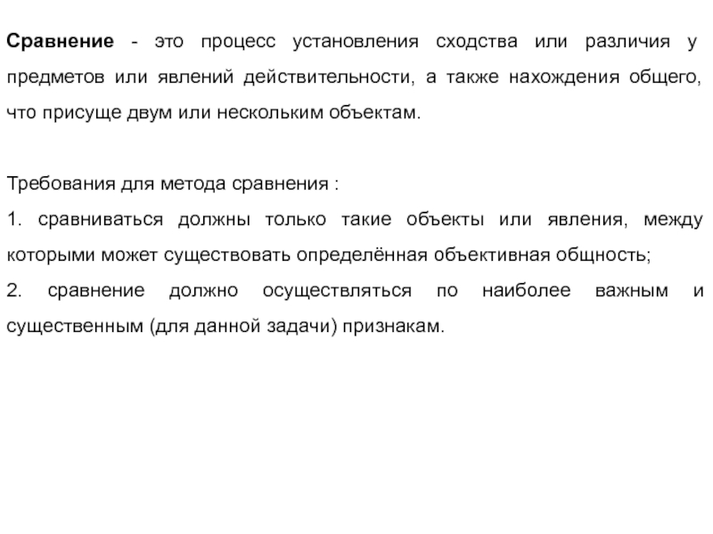 1. сравниваться должны только такие объекты или явления, между которыми может существовать определённая объективная общность;