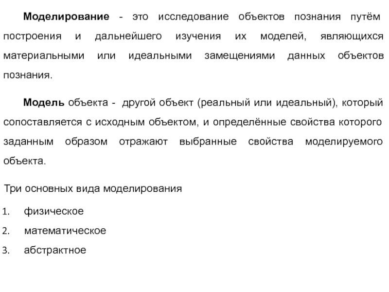 и отношений реальных объектов и явлений и выделение лишь главных сторон, интересующих исследователя.