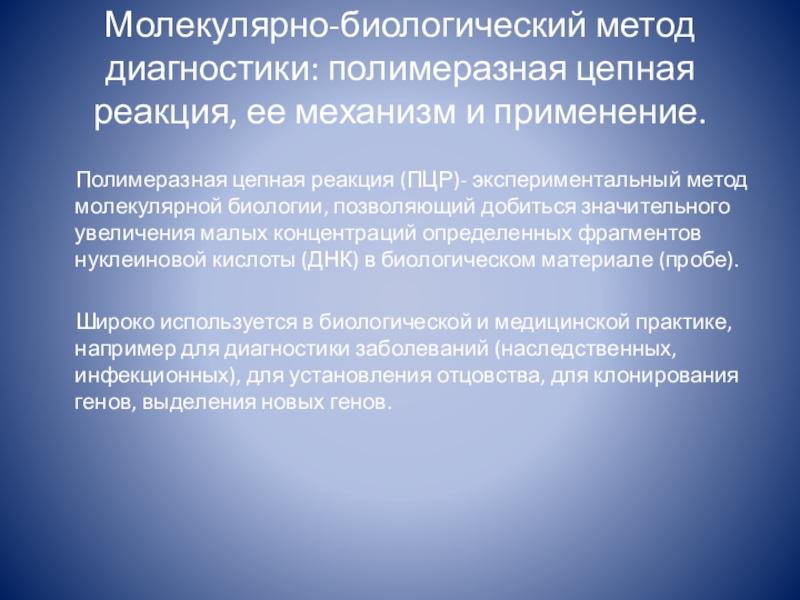 Слайд 10Молекулярно-биологический метод диагностики: полимеразная цепная реакция, ее механизм и применение.
