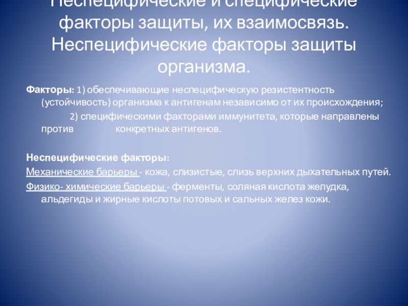 специфические факторы защиты, их взаимосвязь. Неспецифические факторы защиты организма.