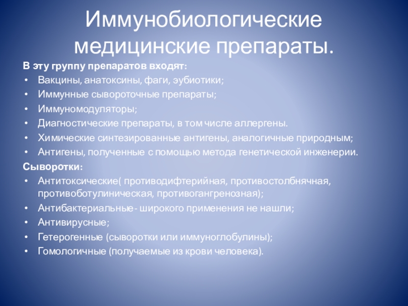 Антитоксические( противодифтерийная, противостолбнячная, противоботулиническая, противогангренозная);