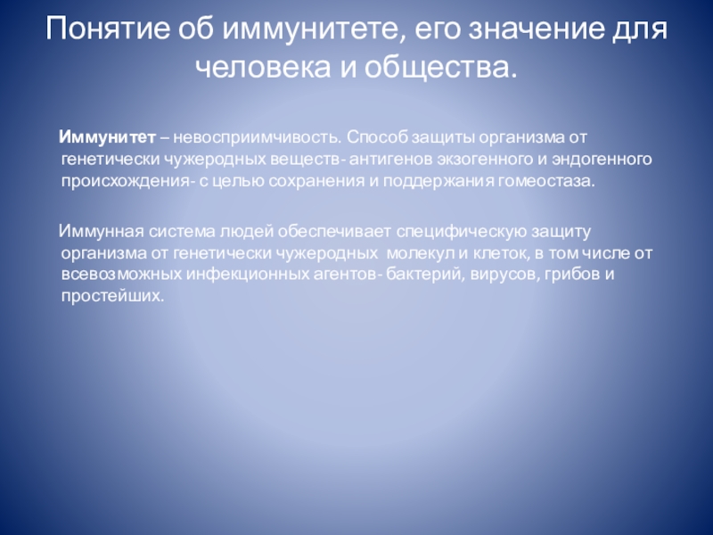 Слайд 3Понятие об иммунитете, его значение для человека и общества.