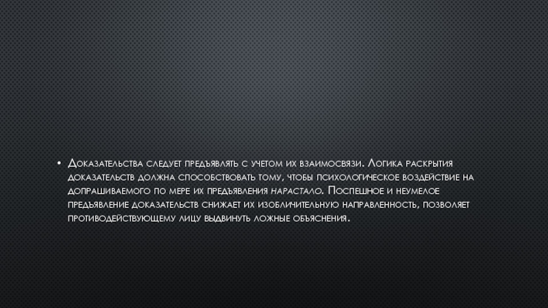 Доказательства следует предъявлять с учетом их взаимосвязи. Логика раскрытия доказательств должна способствовать тому, чтобы психологическое воздействие на