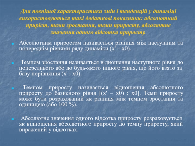 Абсолютним приростом називається різниця між наступним та попереднім рівнями ряду динаміки (х' – х0).
