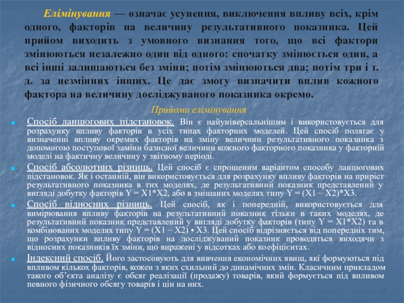 Індексний спосіб. Його застосовують для вивчення економічних явищ, які формуються під впливом кількох факторів, кожен з яких схильний до динамічних змін. Класичним прикладом такого об’єкта аналізу є обсяг реалізації (продажу) товарів, який формується під впливом певного фізичного обсягу товарів і цін на них.