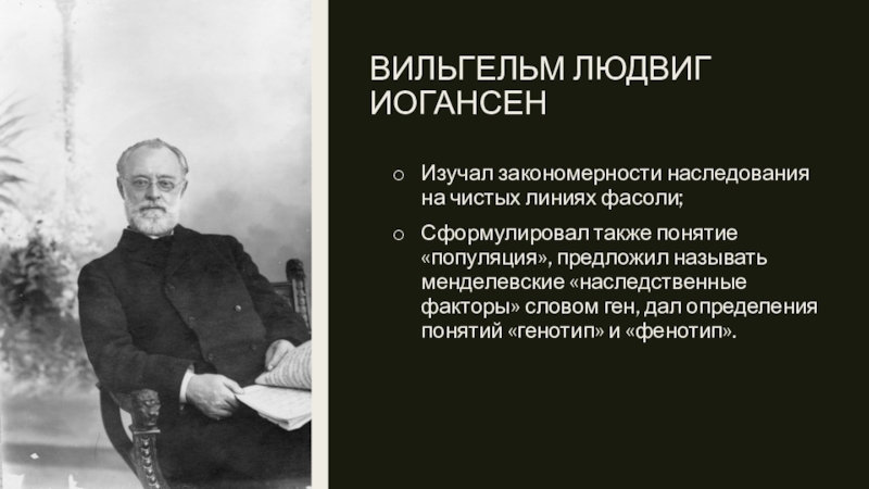понятие «популяция», предложил называть менделевские «наследственные факторы» словом ген, дал