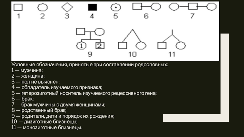 Слайд 16Условные обозначения, принятые при составлении родословных: