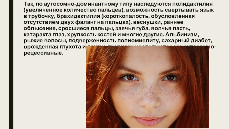 на пальцах), веснушки, раннее облысение, сросшиеся пальцы, заячья губа, волчья пасть, катаракта глаз, хрупкость костей и многие другие. Альбинизм, рыжие волосы, подверженность полиомиелиту, сахарный диабет, врожденная глухота и другие признаки наследуются как аутосомно-рецессивные.