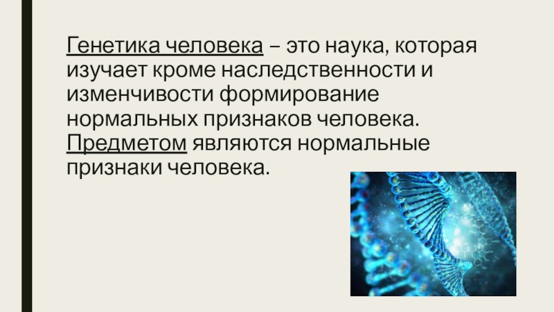 Слайд 2Генетика человека – это наука, которая изучает кроме наследственности и