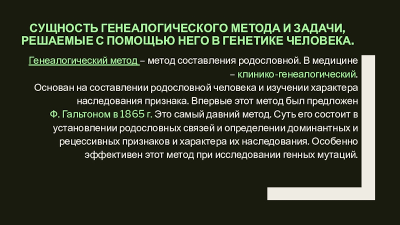 Слайд 13Сущность генеалогического метода и задачи, решаемые с помощью него в