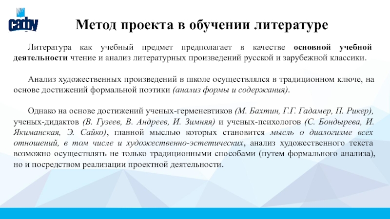 Однако на основе достижений ученых-герменевтиков (М. Бахтин, Г.Г. Гадамер, П. Рикер), ученых-дидактов (В. Гузеев, В. Андреев, И. Зимняя) и ученых-психологов (С. Бондырева, И. Якиманская, Э. Сайко), главной мыслью которых становится мысль о диалогизме всех отношений, в том числе и художественно-эстетических, анализ художественного текста возможно осуществлять не только традиционными способами (путем формального анализа), но и посредством реализации проектной деятельности.