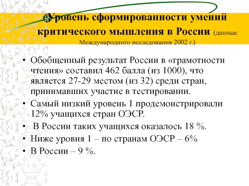 Слайд 4Уровень сформированности умений критического мышления в России (данные Международного исследования