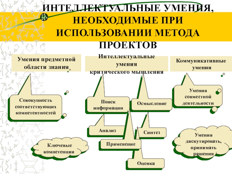 Слайд 12ИНТЕЛЛЕКТУАЛЬНЫЕ УМЕНИЯ, НЕОБХОДИМЫЕ ПРИ ИСПОЛЬЗОВАНИИ МЕТОДА ПРОЕКТОВ