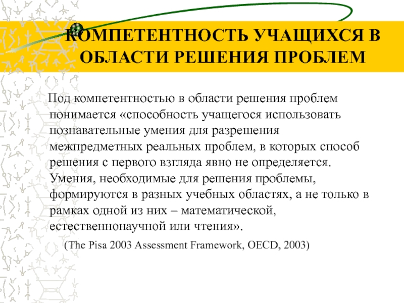 разрешения межпредметных реальных проблем, в которых способ решения с первого взгляда явно не определяется. Умения, необходимые для решения проблемы, формируются в разных учебных областях, а не только в рамках одной из них – математической, естественнонаучной или чтения».