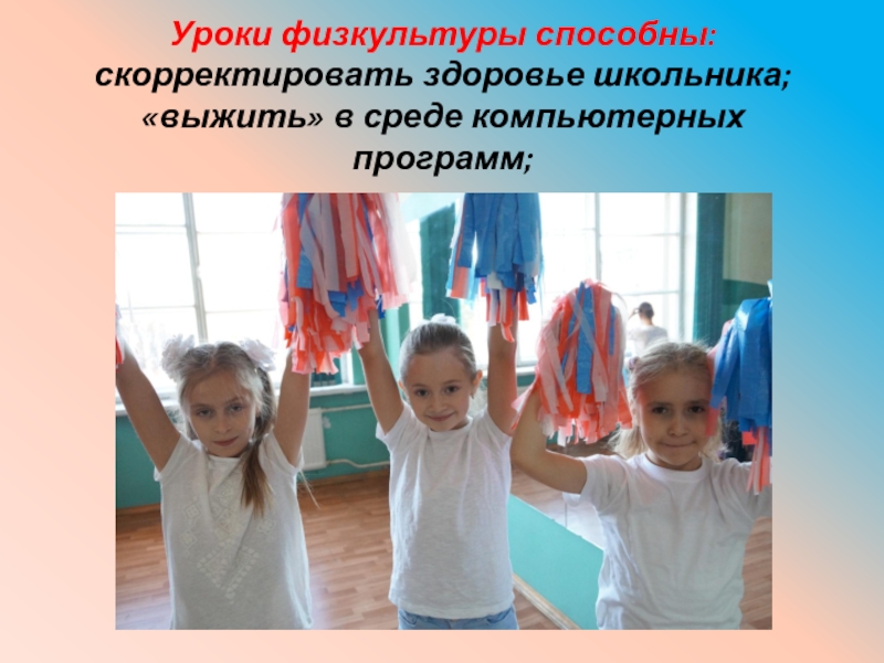 Слайд 13Уроки физкультуры способны: скорректировать здоровье школьника; «выжить» в среде компьютерных