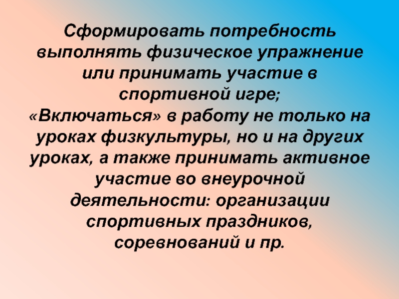 Слайд 15Сформировать потребность выполнять физическое упражнение или принимать участие в спортивной