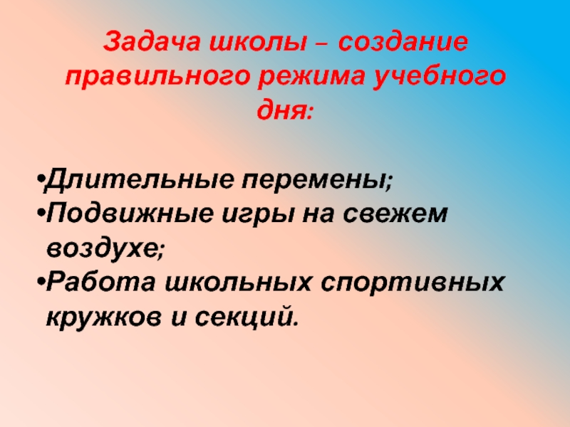 Слайд 32Задача школы – создание правильного режима учебного дня: