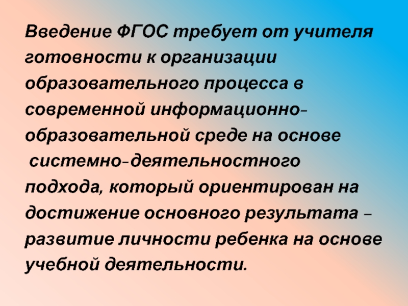 Слайд 34Введение ФГОС требует от учителя готовности к организации образовательного процесса